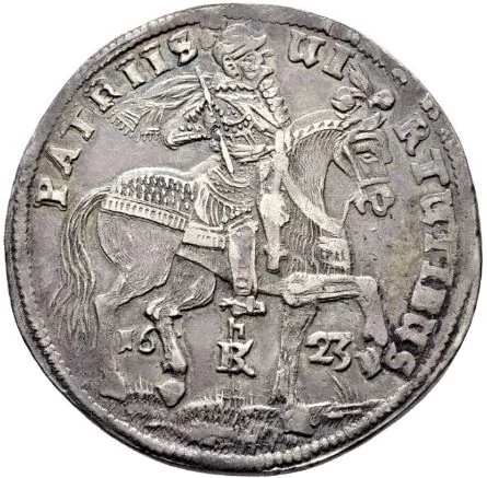 Armored bishop on horseback riding right, date split between hooves, mintmaster's symbol below stirrup.