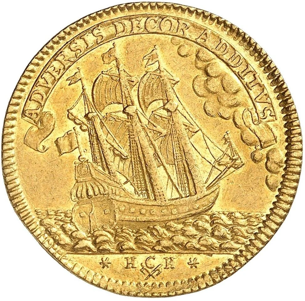 Three-masted sailing ship right, curved legend above, mintmaster’s initials and symbol in exergue.