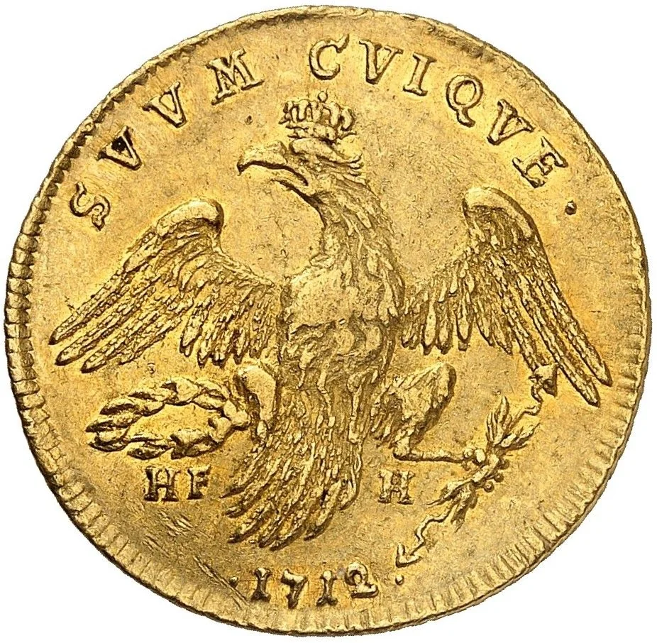 Crowned eagle with laurel wreath and lightning, date beneath.