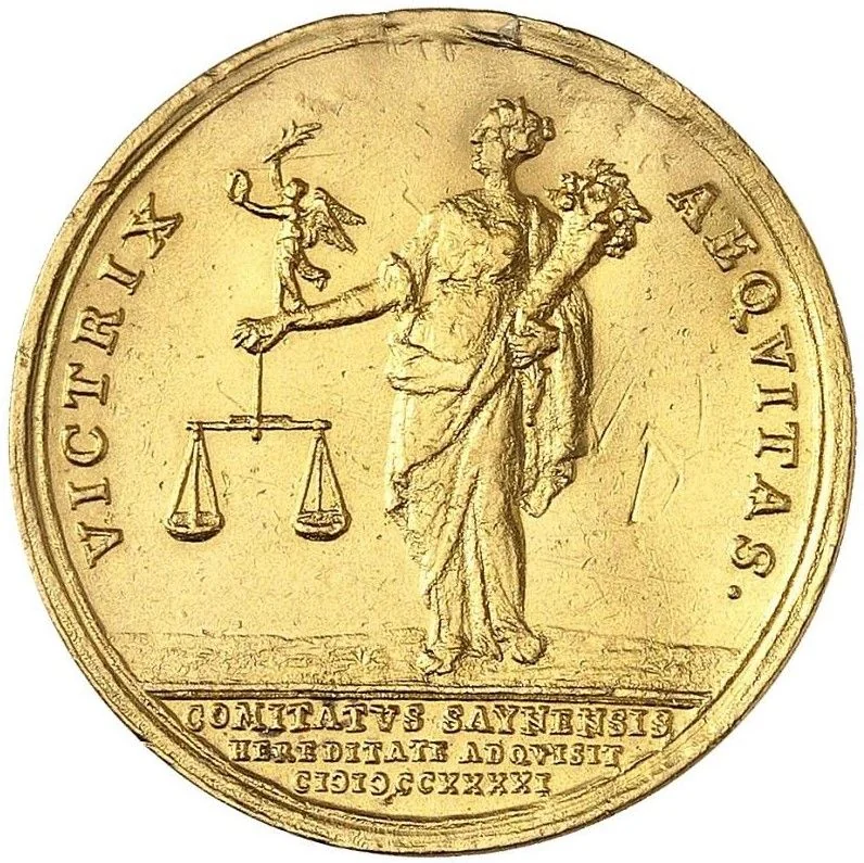 Figure of Justice with scales and cornucopia, flanked by legends, three-line inscription above dated exergue.