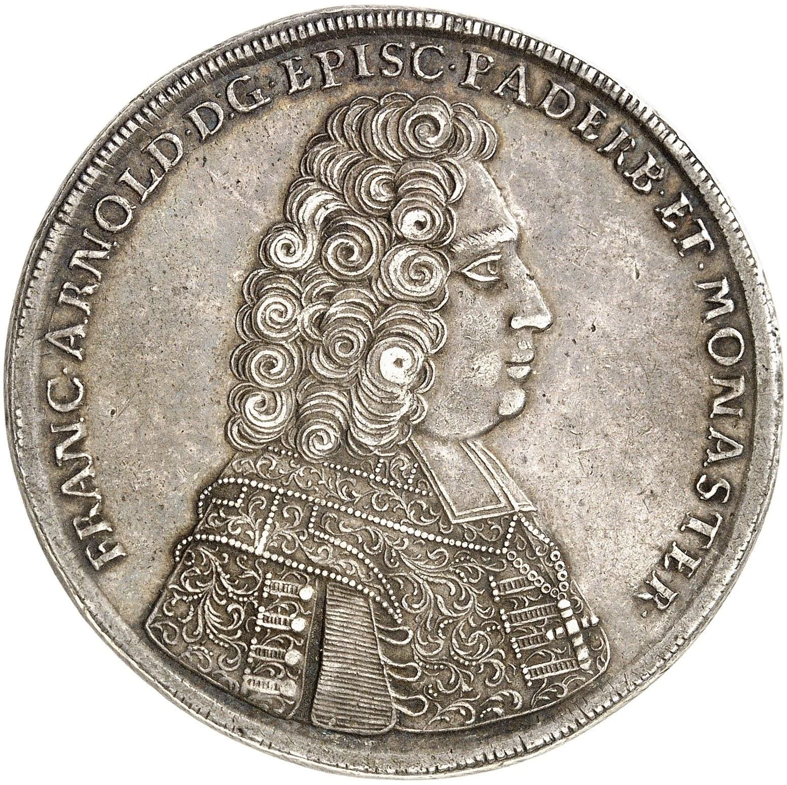Description: Oval shield with eight arms, central Wolff-Metternich coat of arms in baroque frame, over crossed sword and crozier. Mintmaster initials flank bottom, motto on band below, date in legend.