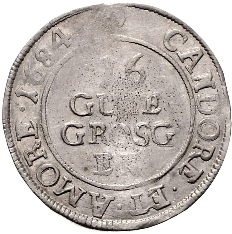Shield with quartered arms in baroque frame, over crossed sword and crozier.