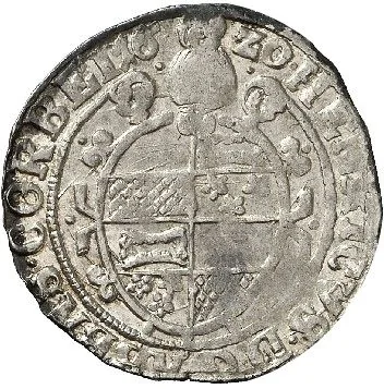 Oval baroque shield with quartered arms on crossed croziers, topped by a mitre over the date.
