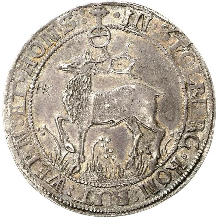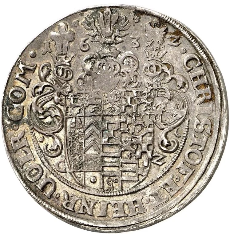 Three helmets over an eleven-part shield, date in helmet plumes, titles of two counts.