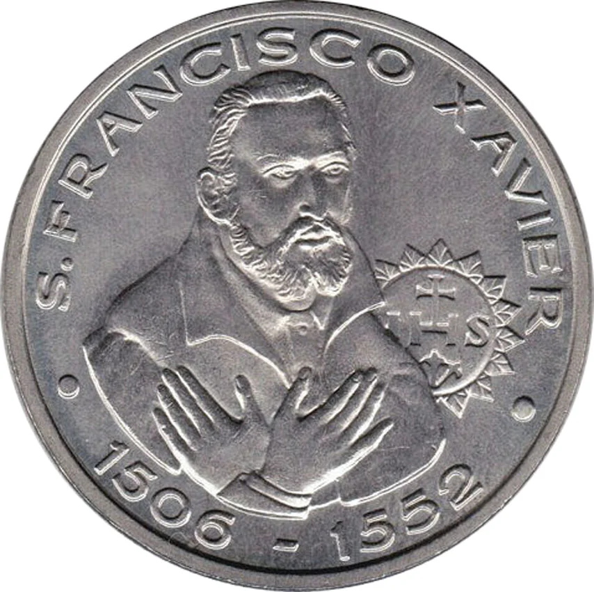 A 16th-century ship in a storm. Five sailors hold Saint Francis Xavier above the waves, performing a miracle to calm the sea. The arms of Portugal are at left, with value and dates below.