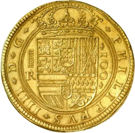 Spanish coat of arms with Portuguese arms, seven-arched mint mark.