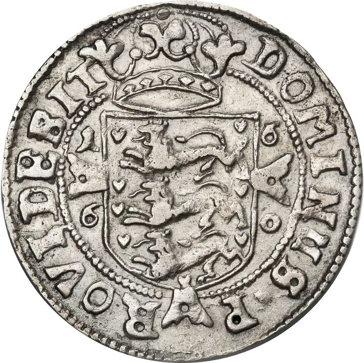 King’s crowned monogram within beaded circle. Legend shows value ending with “IS,” initials of Jacob Schwieger, Glückstadt coinage tenant (1644–1660).