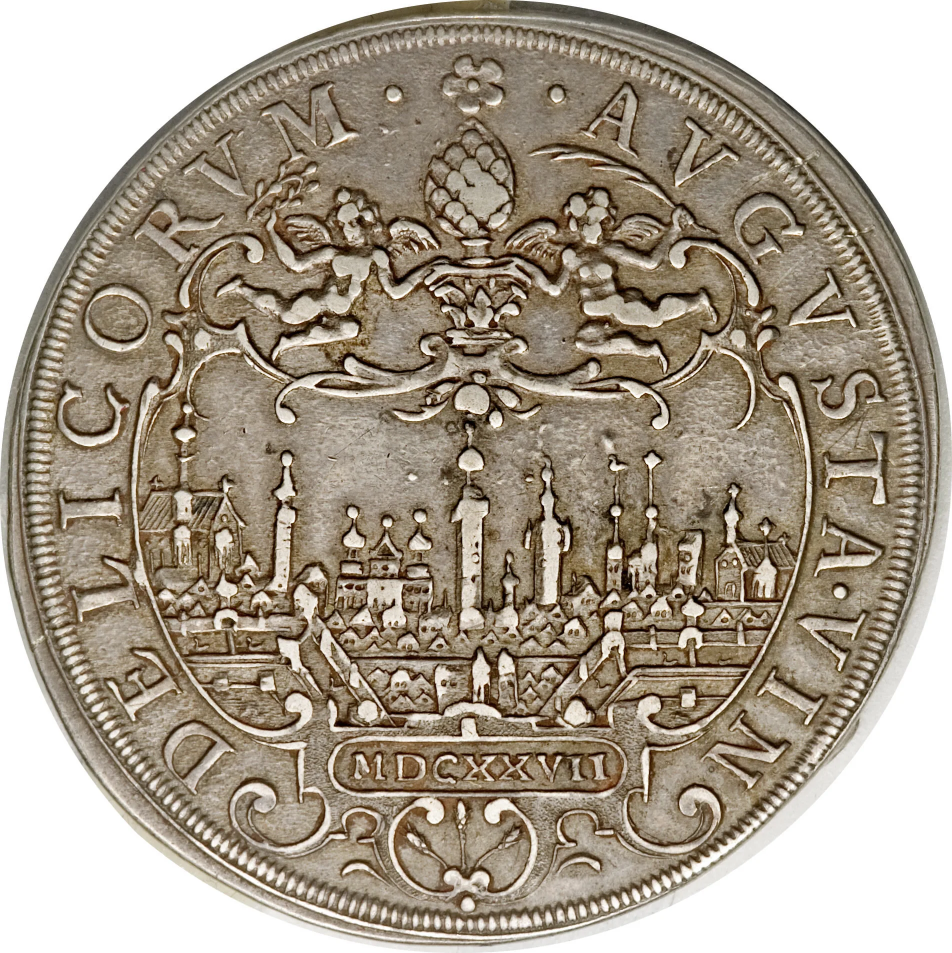 Augsburg city view, its pine cone symbol held by two angels, with Roman numeral date and Latin legend.