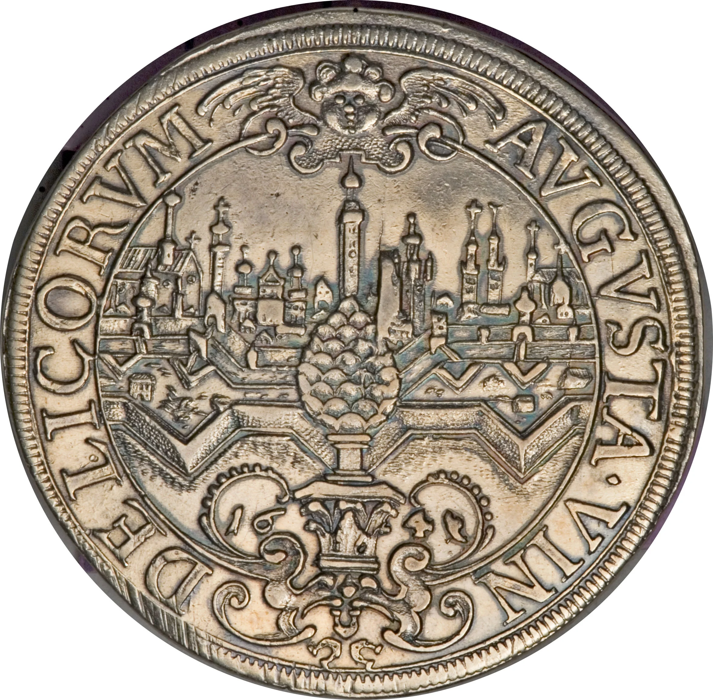 City emblem in a circle with baroque ornaments, an angel above, and Augsburg's pine cone symbol in the center. Date within the lower ornaments.