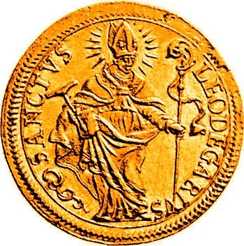 Saint Leodegar stands facing right, wearing a mitre and holding a drill in his right hand and a crosier in his left.