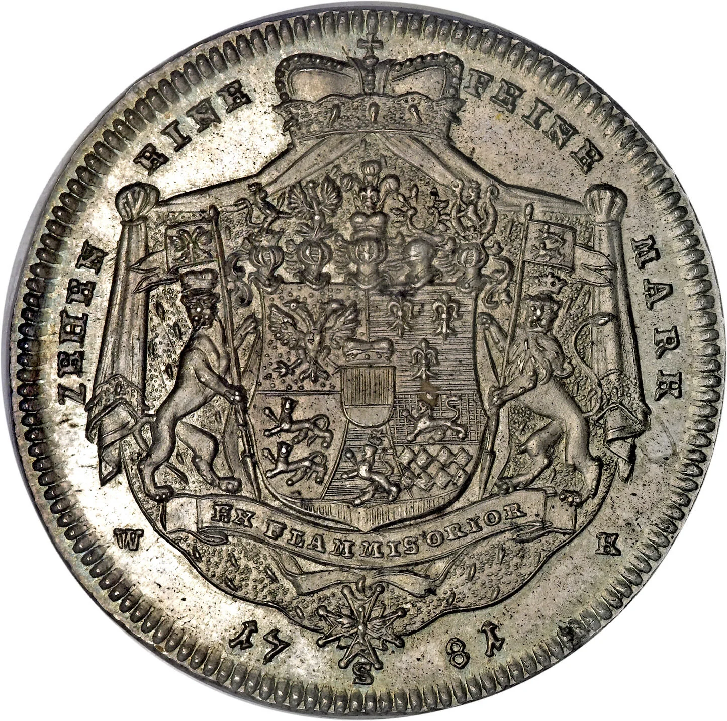 Crowned coat of arms with surrounding legend and date.