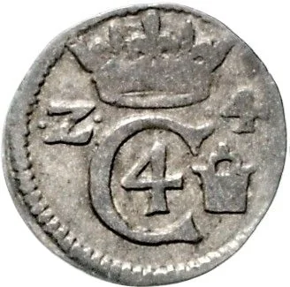 Crown over large 'C' enclosing '4', splits date.