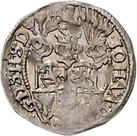 Four-armed cross with central shield, three helmets above, encircled by Johann Adolf's titles.