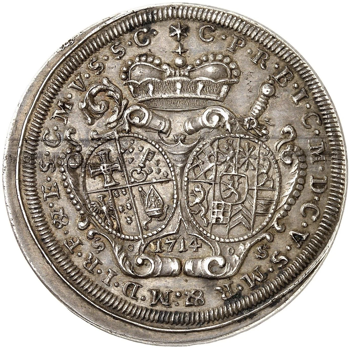 Two crowned shields on scrolls, date below, mintmaster's initials flanking.
