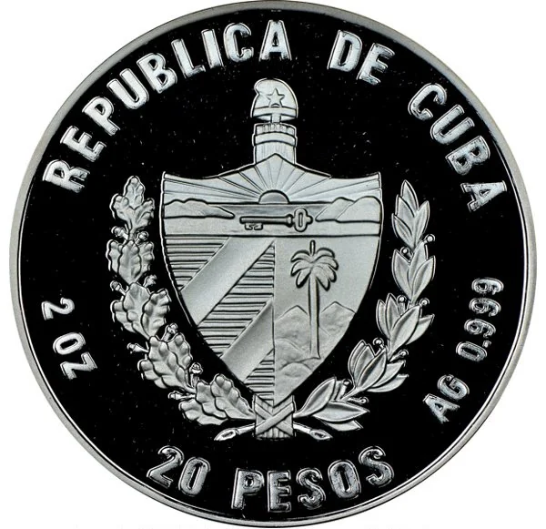 Cuban coat of arms with country name above, face value below, and weight/fineness on the sides.