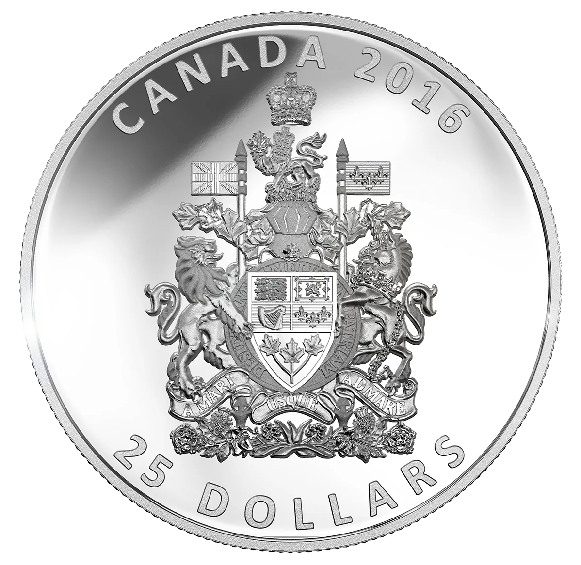 The reverse features Canada's Coat of Arms, including a shield with royal symbols of England, Scotland, Ireland, and France, plus three maple leaves. Floral emblems and the motto "A MARI USQUE AD MARE" are below. Supporters flank the shield: a lion with the Union Jack and a unicorn with the French royal flag. Above are a helmet with maple leaves, a crest of a crowned lion holding a maple leaf, and the imperial crown. Also engraved are "25 DOLLARS", "CANADA", and "2016".