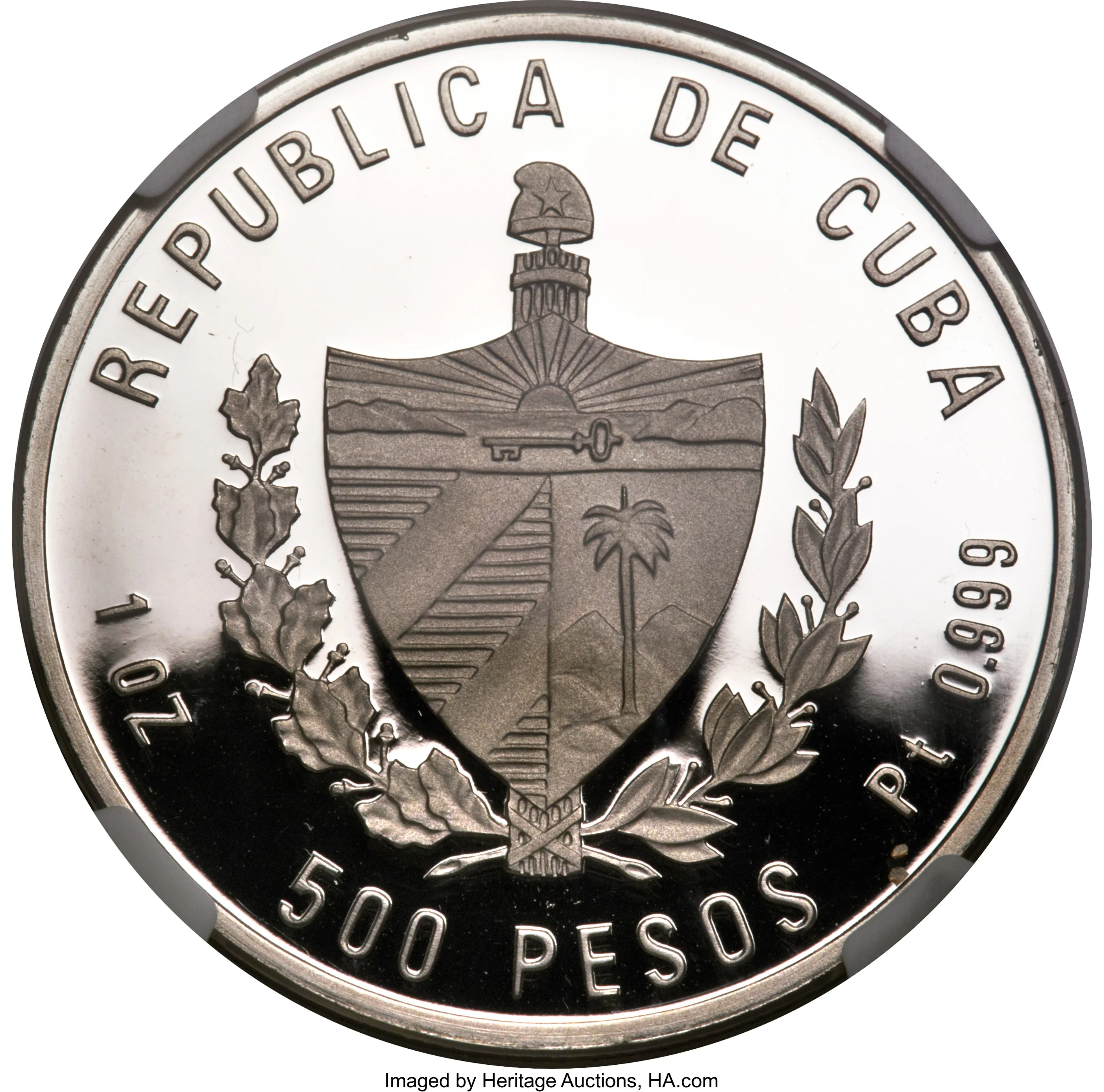 Cuban coat of arms with country name above, face value below, and weight/fineness on the sides.