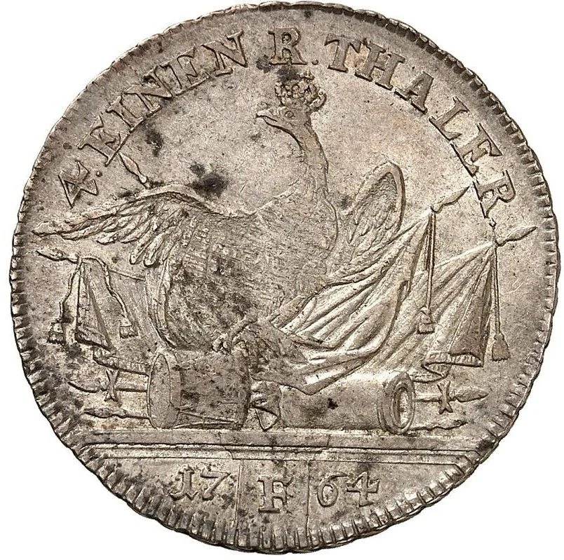 Eagle above crossed flags and cannons, mintmark beside date, flags tasseled.