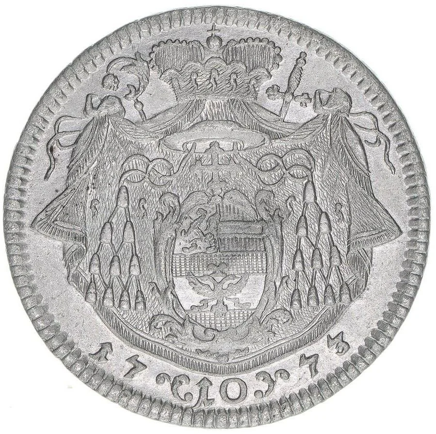 Oval shield with Salzburg's coat of arms under a cross and cardinal's hat, over a crowned mantle. Denomination in frame below splits the date.