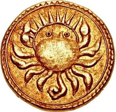 Crab with a sunburst behind.