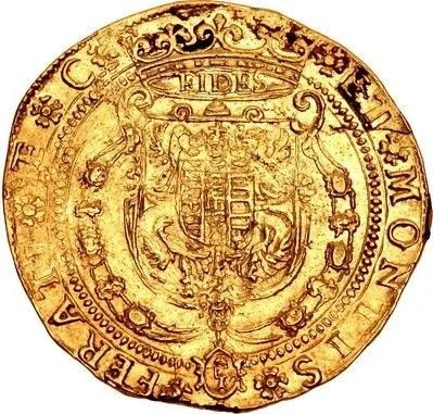 Shield of four quarters, with a central nine-part shield, in a baroque frame with a crown and "FIDES" above, surrounded by the Order of the Redeemer.
