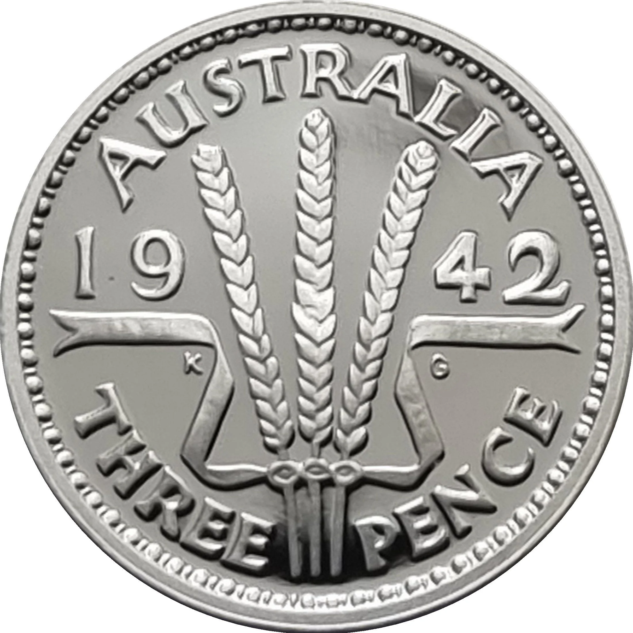 1942 Threepence: KM#37 reverse with three wheat heads and ribbon.