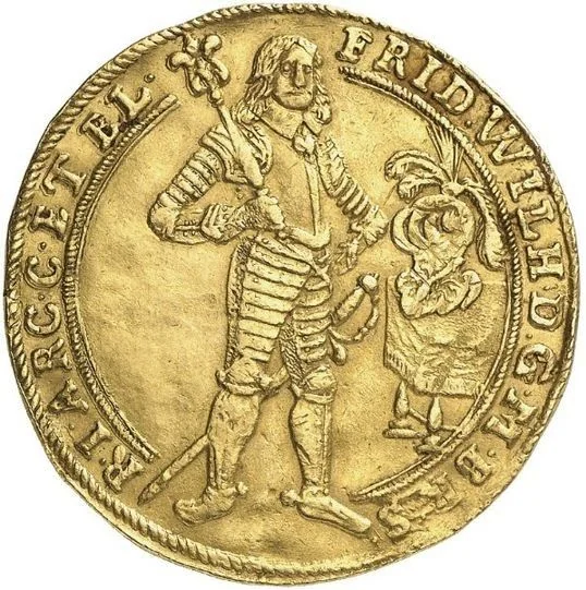 Friedrich Wilhelm beside a helmeted table.