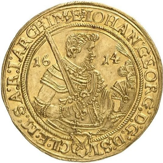 Half-length figure of Johann Georg with sword and helmet in center, year flanking bust, encircled by inscription.