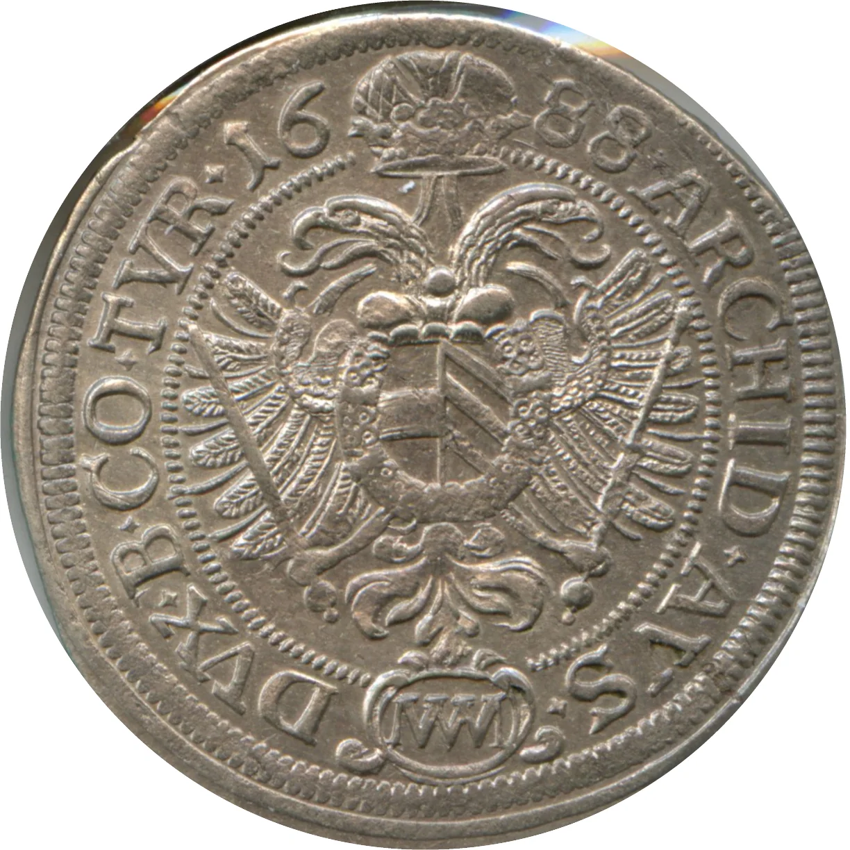 Leopold I in armor, facing right with the Golden Fleece. Framed roman numeral value below.