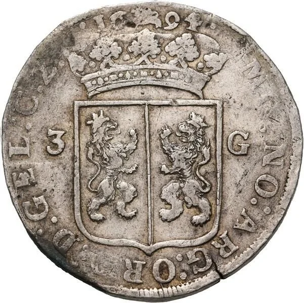 Shield of Gelderland divides value. Date above crown, split by privy mark.