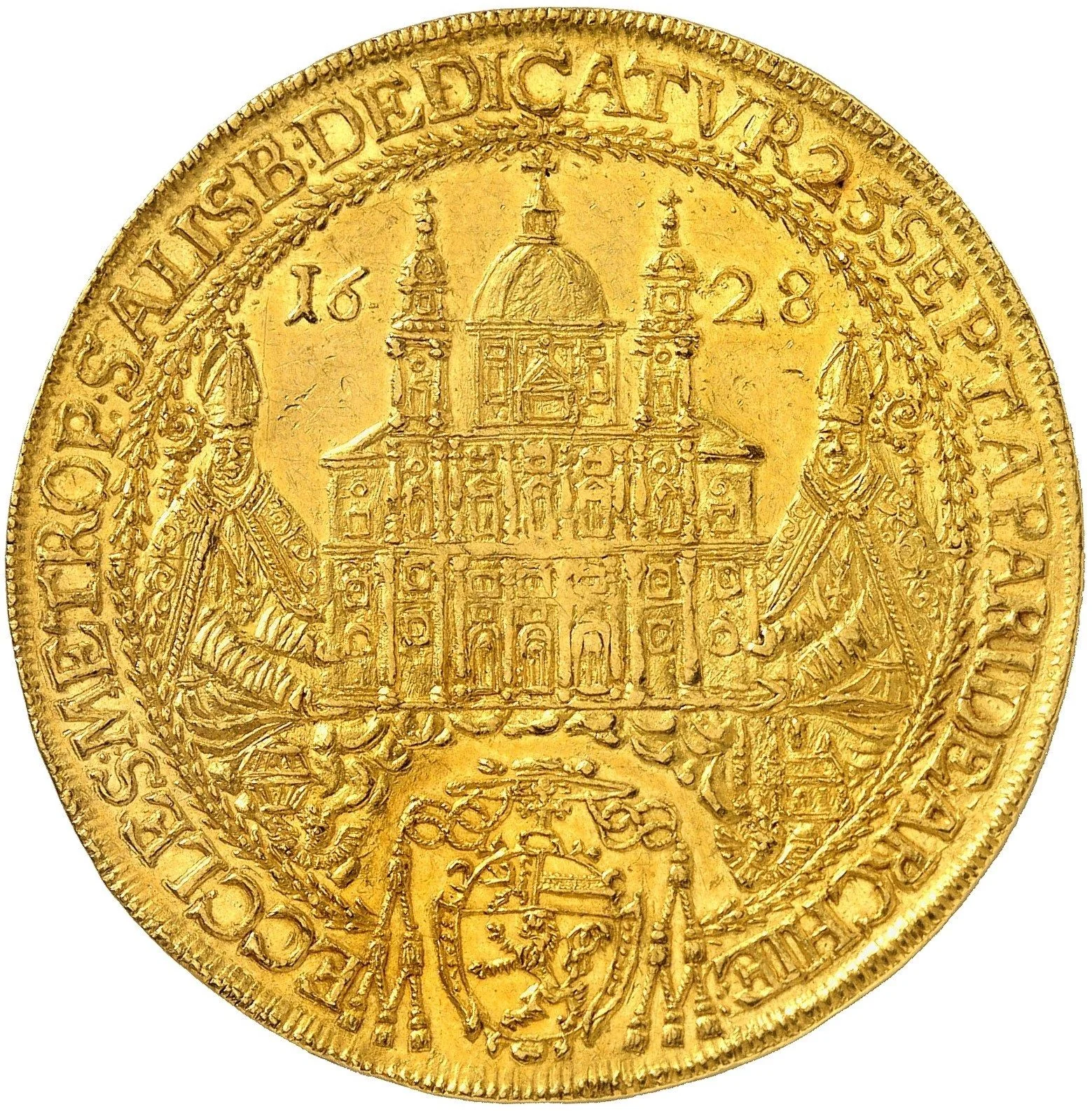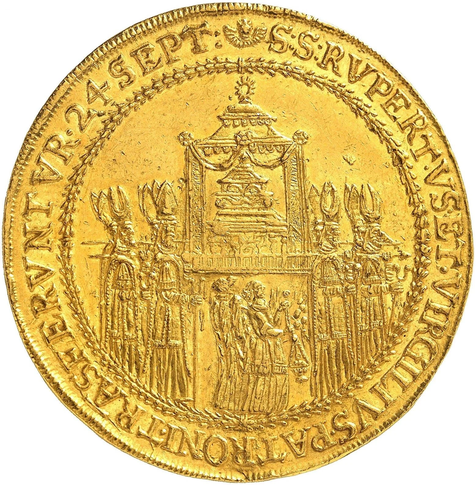 Salzburg Cathedral divides the date between St. Rupert (left) and St. Virgilius (right). The city's arms below split the surrounding legend, which begins at 7 o'clock.