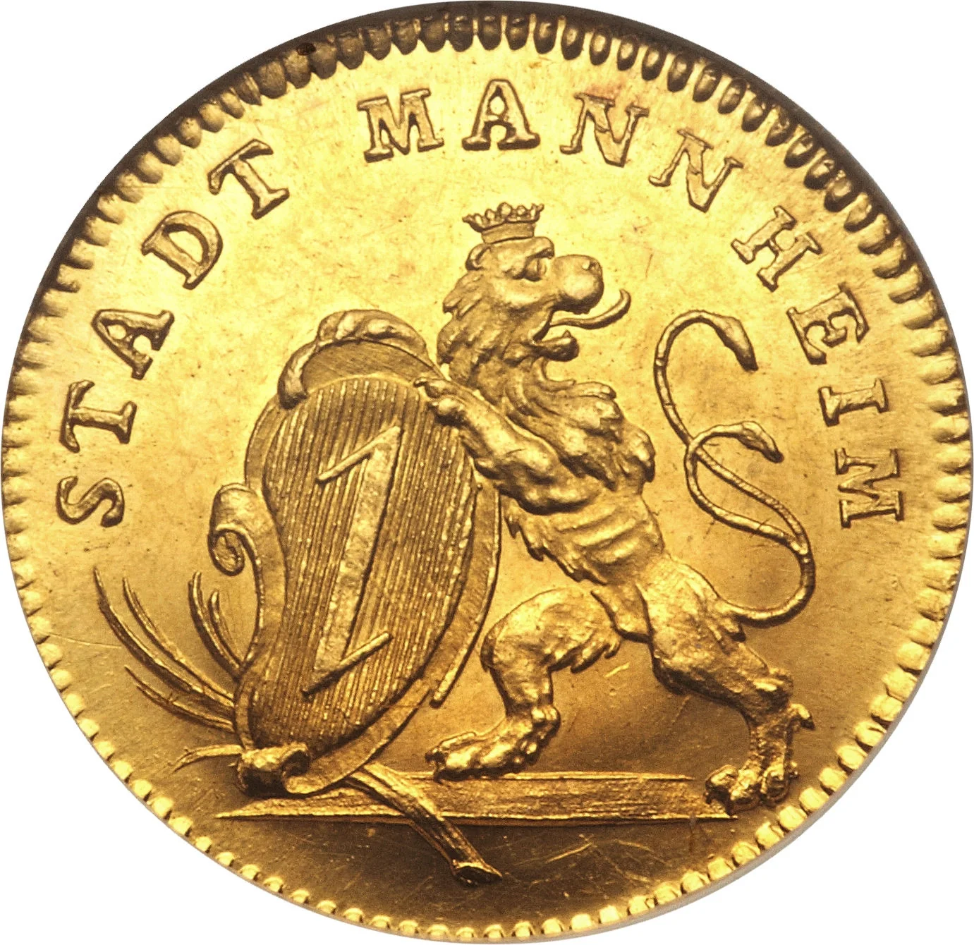 Crowned lion holding a shield, legend above.