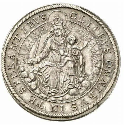 Description: Oval shield with quartered arms of Bavaria and the Palatinate, supported by two lions, topped by a ducal cap and the Order of the Golden Fleece below. Clockwise legend ending with a Roman numeral date.