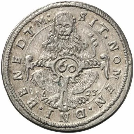 Seated lion facing left, paws on bars, oval with '60' at center, date split by hind paws, all within a single circular line.