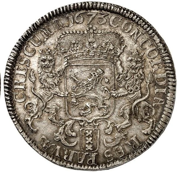 Crowned arms of the United Provinces, flanked by lions, with Amsterdam's shield below and the date above.