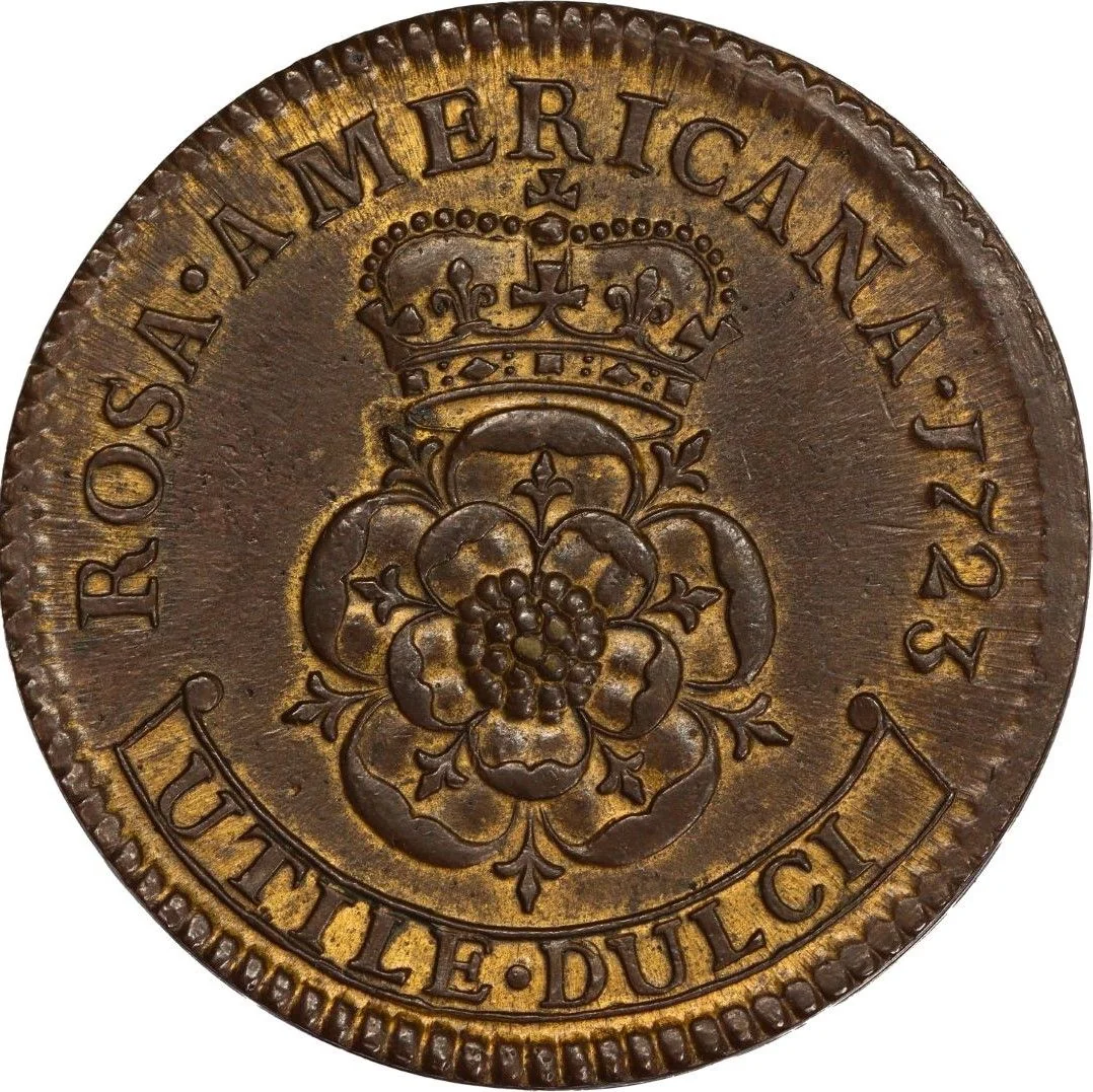 A crowned rose encircled by "ROSA AMERICANA 1723 UTILE DULCI."