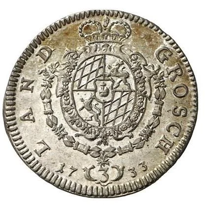 Shield with Bavarian and Palatine arms, central imperial orb, flanked by orders. Numeral 3 above date.