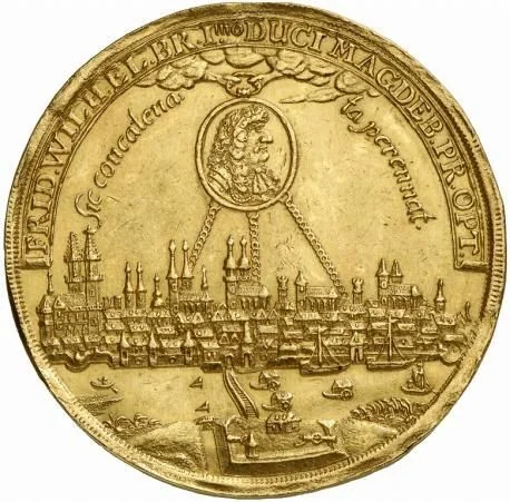 Elector's bust in oval, chained to clouds and Magdeburg.