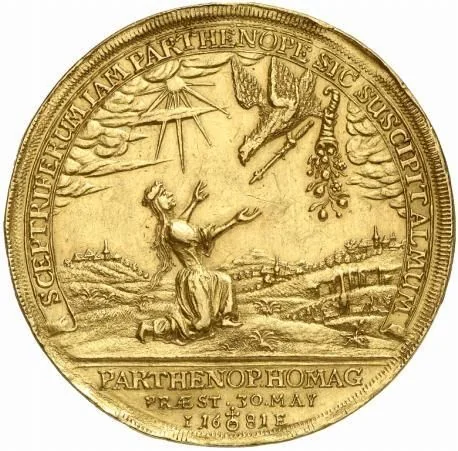 Maiden kneeling in landscape, sun, eagle, and cornucopia in clouds, date below.
