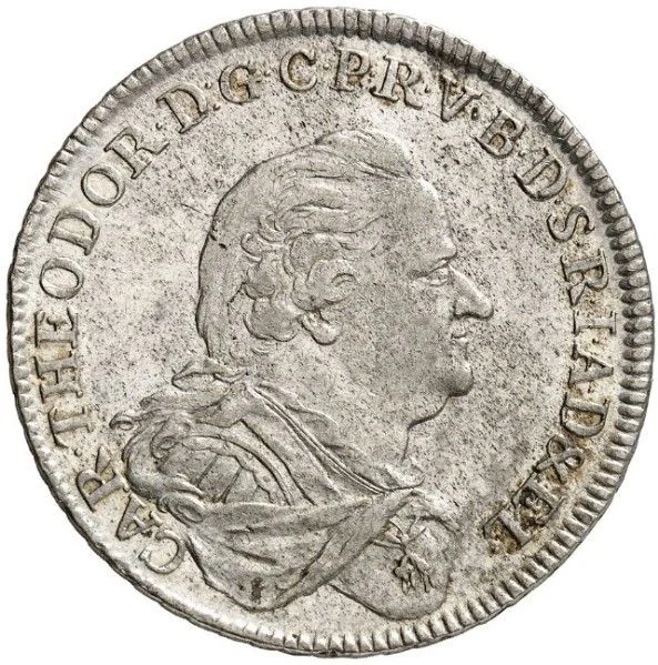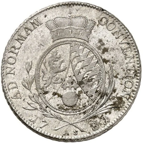 Crowned oval shield with arms of Pfalz-Bavaria and orb, flanked by laurel and palm branches; mintmaster initials and date below.