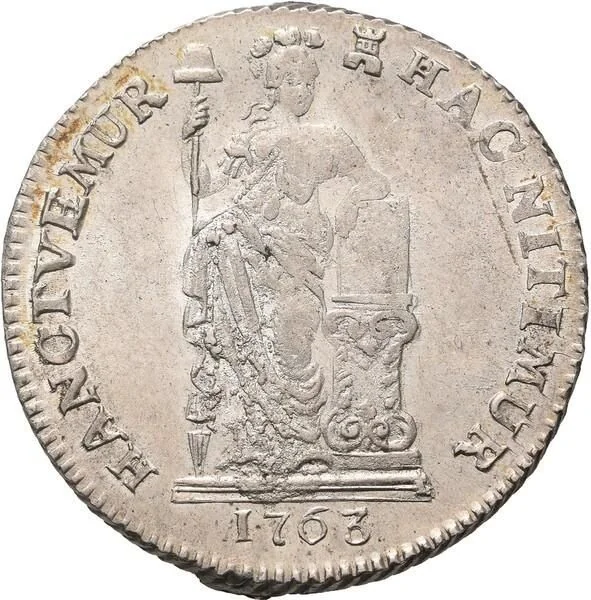 Female figure leaning on a Bible on a column, holding a spear with a Liberty cap. Mint mark precedes legend.