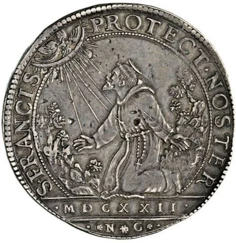 Saint Francis kneeling, receiving the stigmata; date in Roman numerals, mint official's initials below.