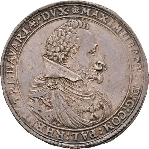 Description: Oval shield with the quartered arms of Bavaria and the Palatinate, a central shield, two lion supporters, an electoral hat between two ornate helmets above, the Order of the Golden Fleece below, and the date flanking mintmaster initials.