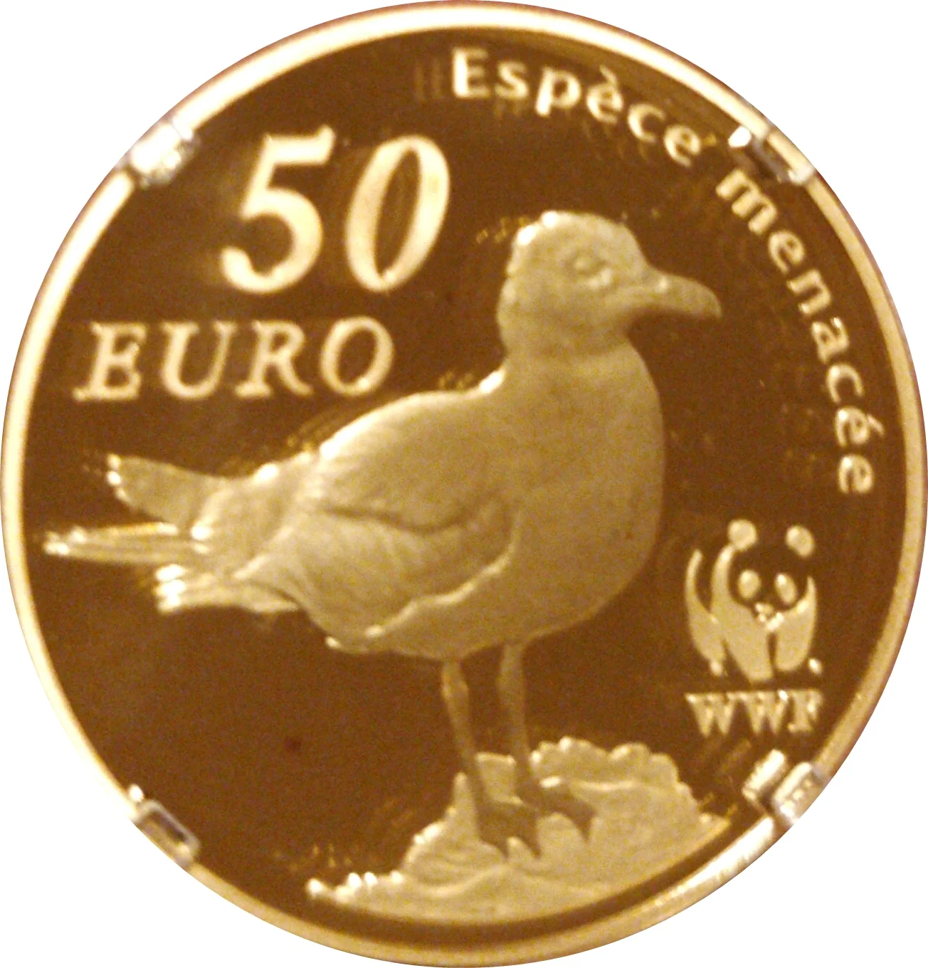 WWF logo with an Audouin's gull, marked "50 EURO" and "Endangered species."