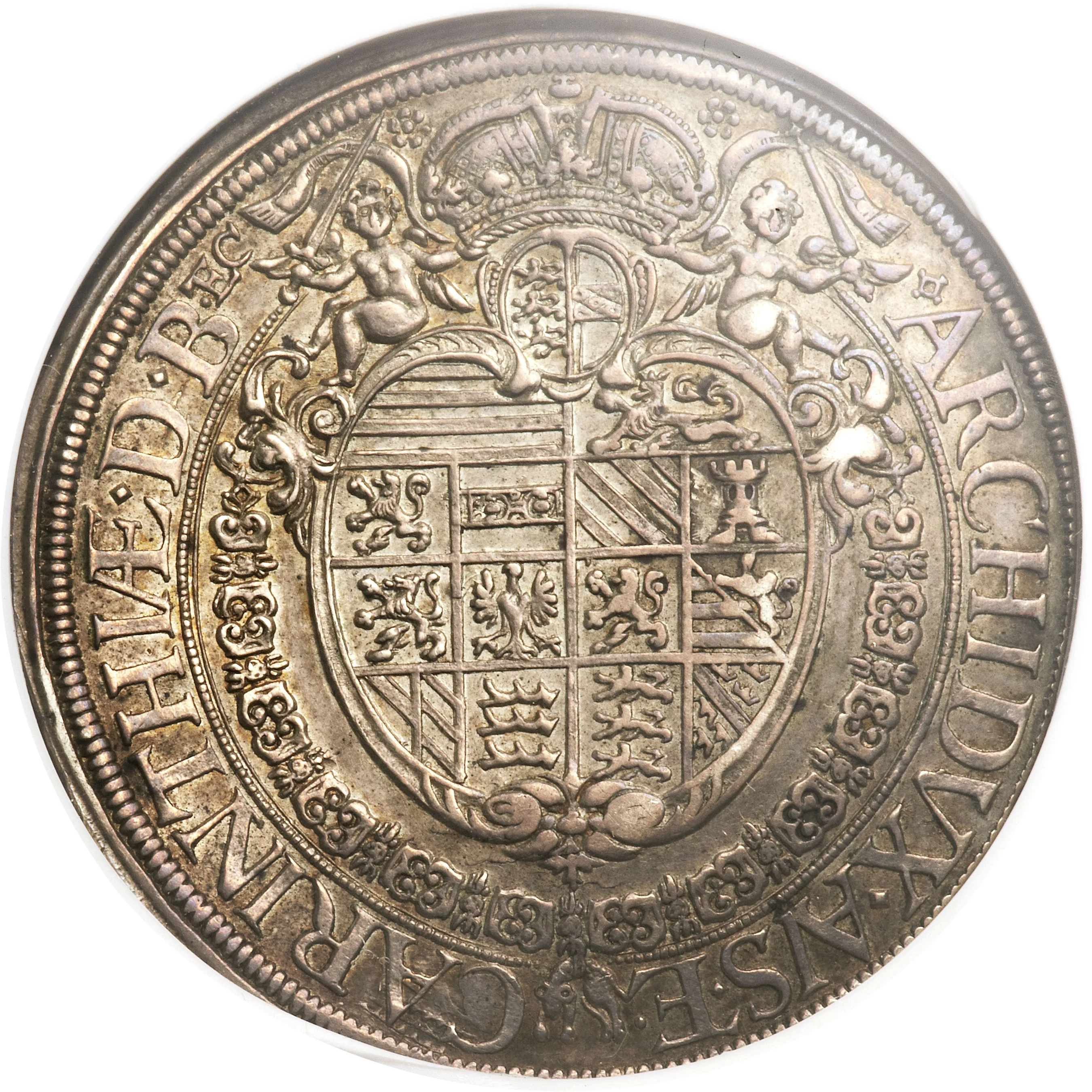Crowned arms with a central shield topped by a smaller Carinthian shield, encircled by the Golden Fleece chain. The crown interrupts the surrounding circle and legend. Legend (1h): ARCHIDUX AUSTRIAE ET CARINTHIAE DUX BURGUNDIAE ETC.