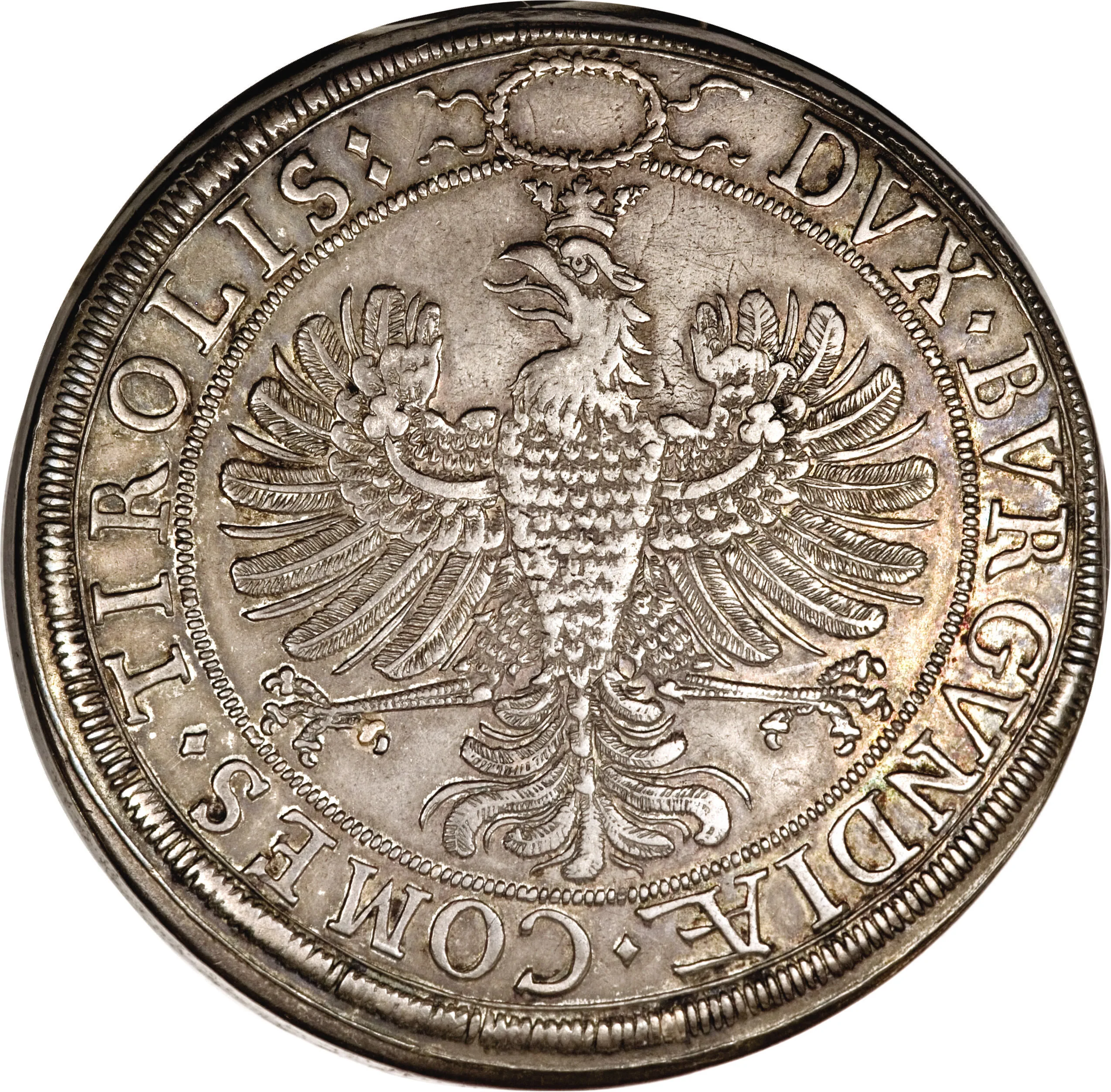 Crowned Tyrolean eagle within a beaded circle, its legend divided by a wreath.