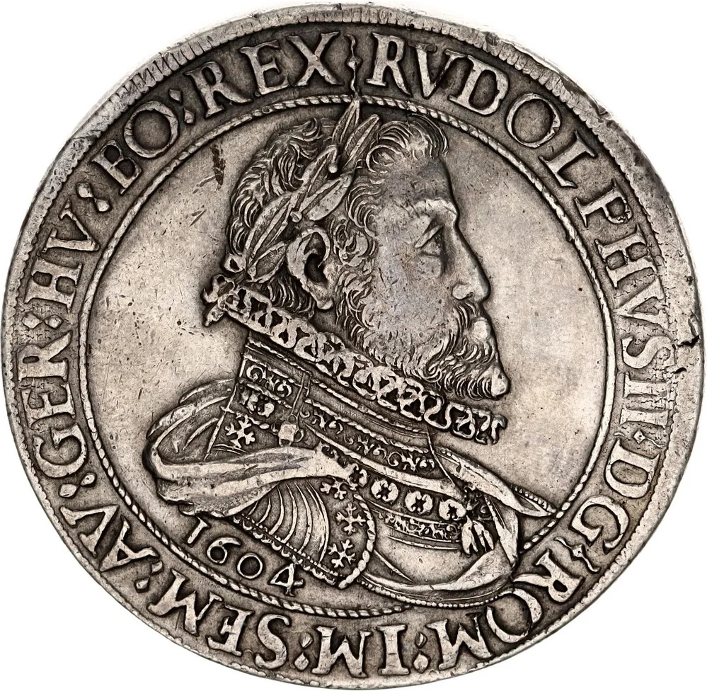Bust of Rudolf II in ornate armor and ruffled collar, facing right within a braided circle; date below, legend begins at 1 o'clock.