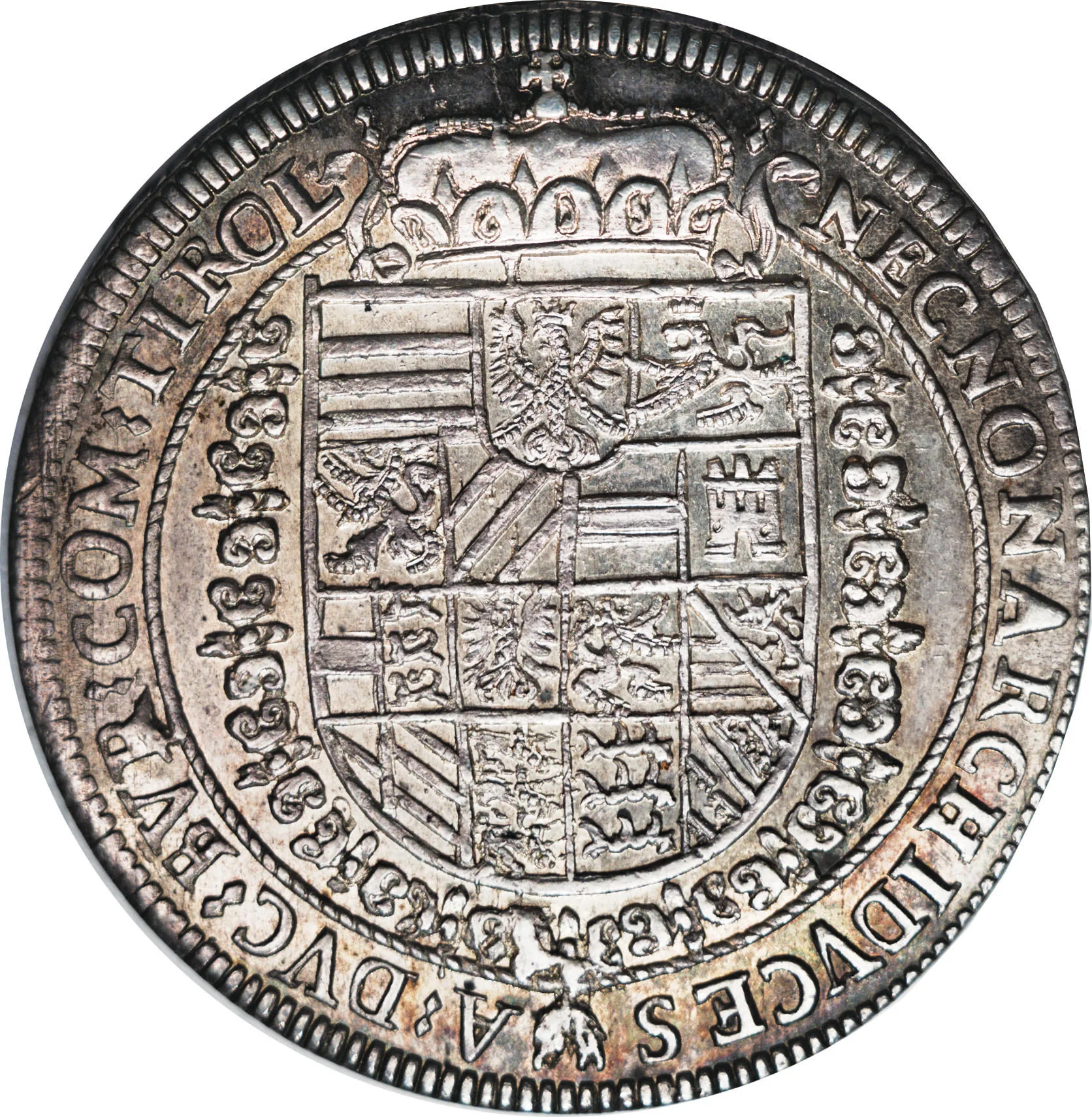Arms with Tyrol at center top under a crown, encircled by the Golden Fleece chain. The fleece divides the legend below, the crown above.