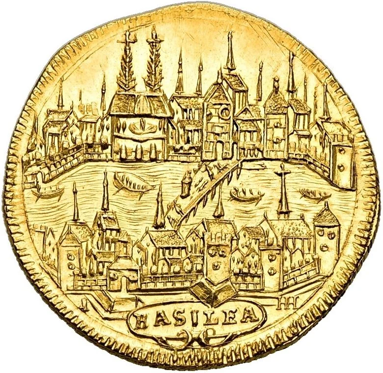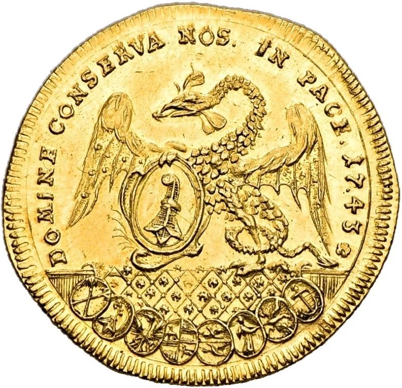 Basilisk with Basel's oval arms on a lattice. Eight oval baliwick arms below.