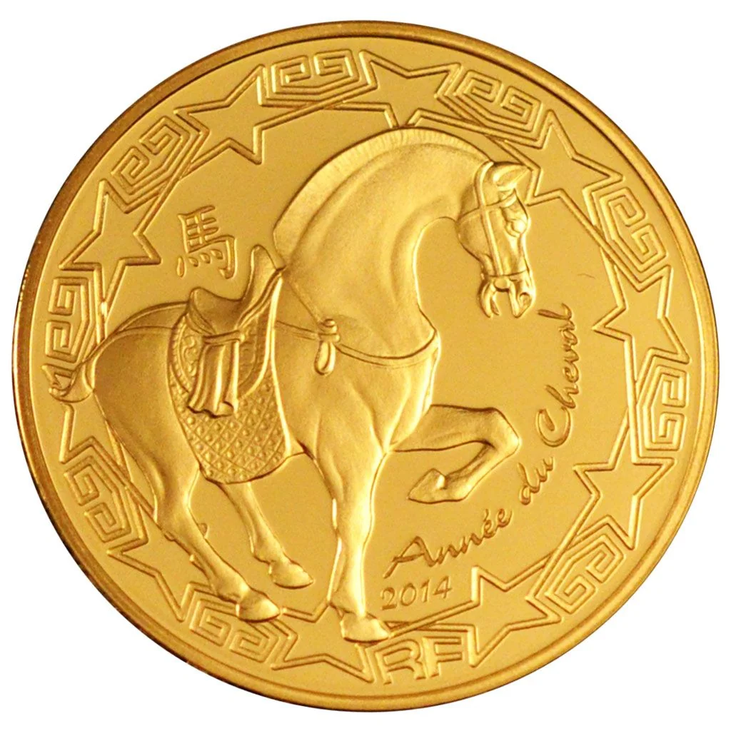 The inner coin features a horse, the seventh Chinese zodiac sign, marking the 2014 Year of the Wooden Horse. Surrounding inscriptions and a frieze near the edge complete the design.